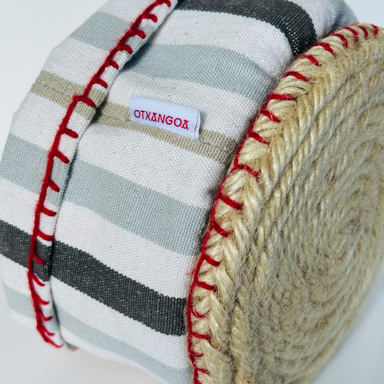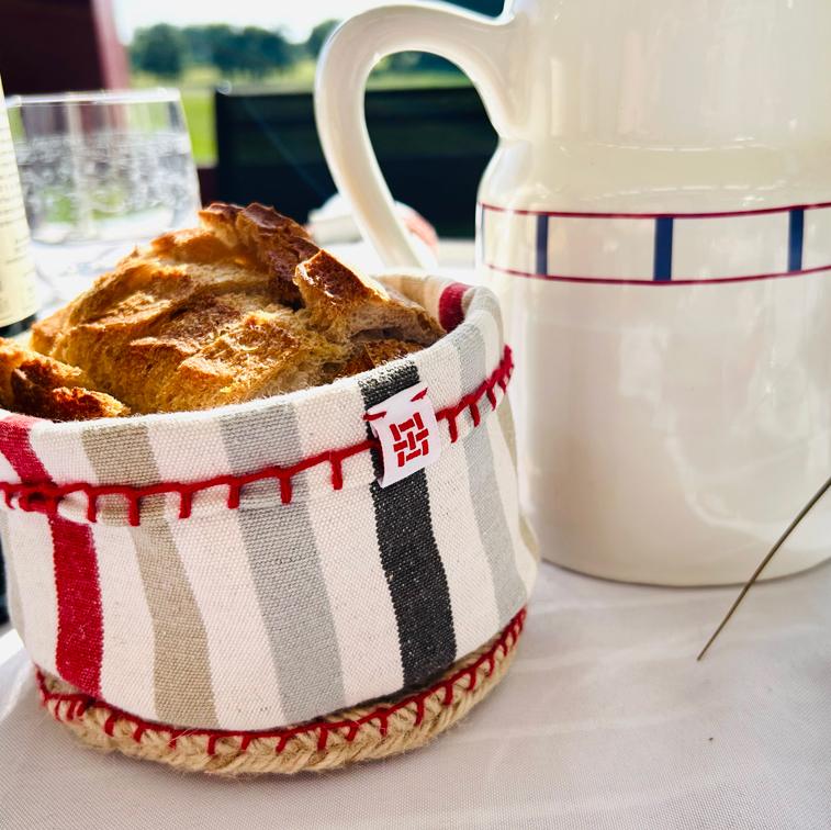 Corbeille à pain réalisée à partir de textile de table revalorisés et de corde en jute, inspirée du savoir-faire de l’espadrille.